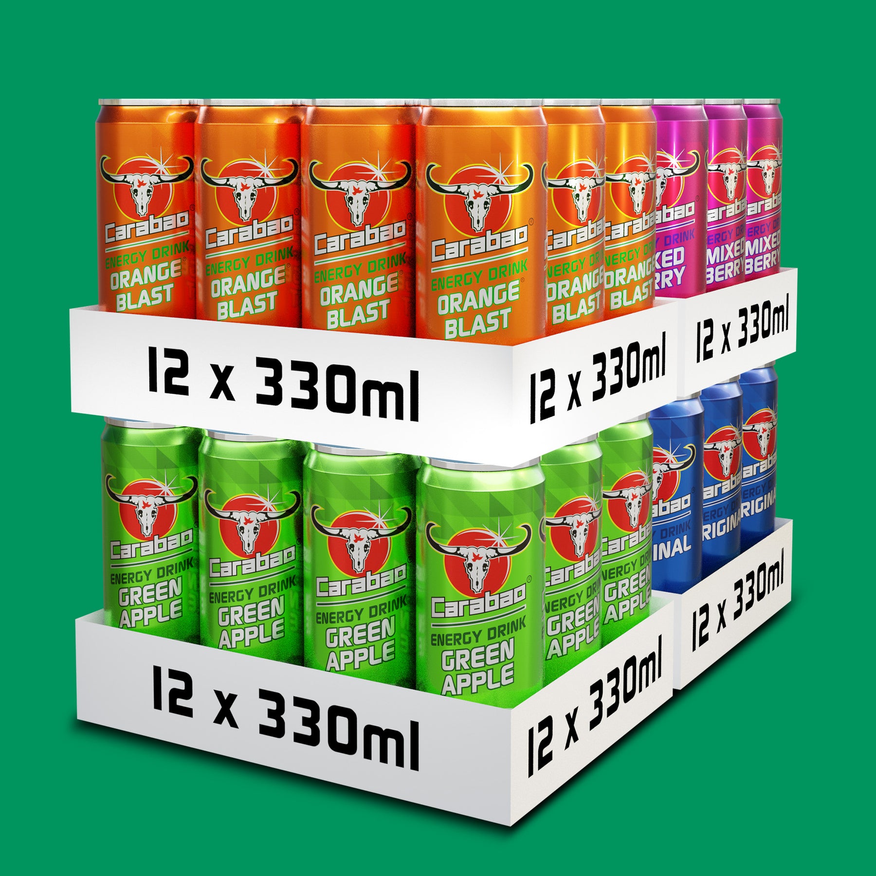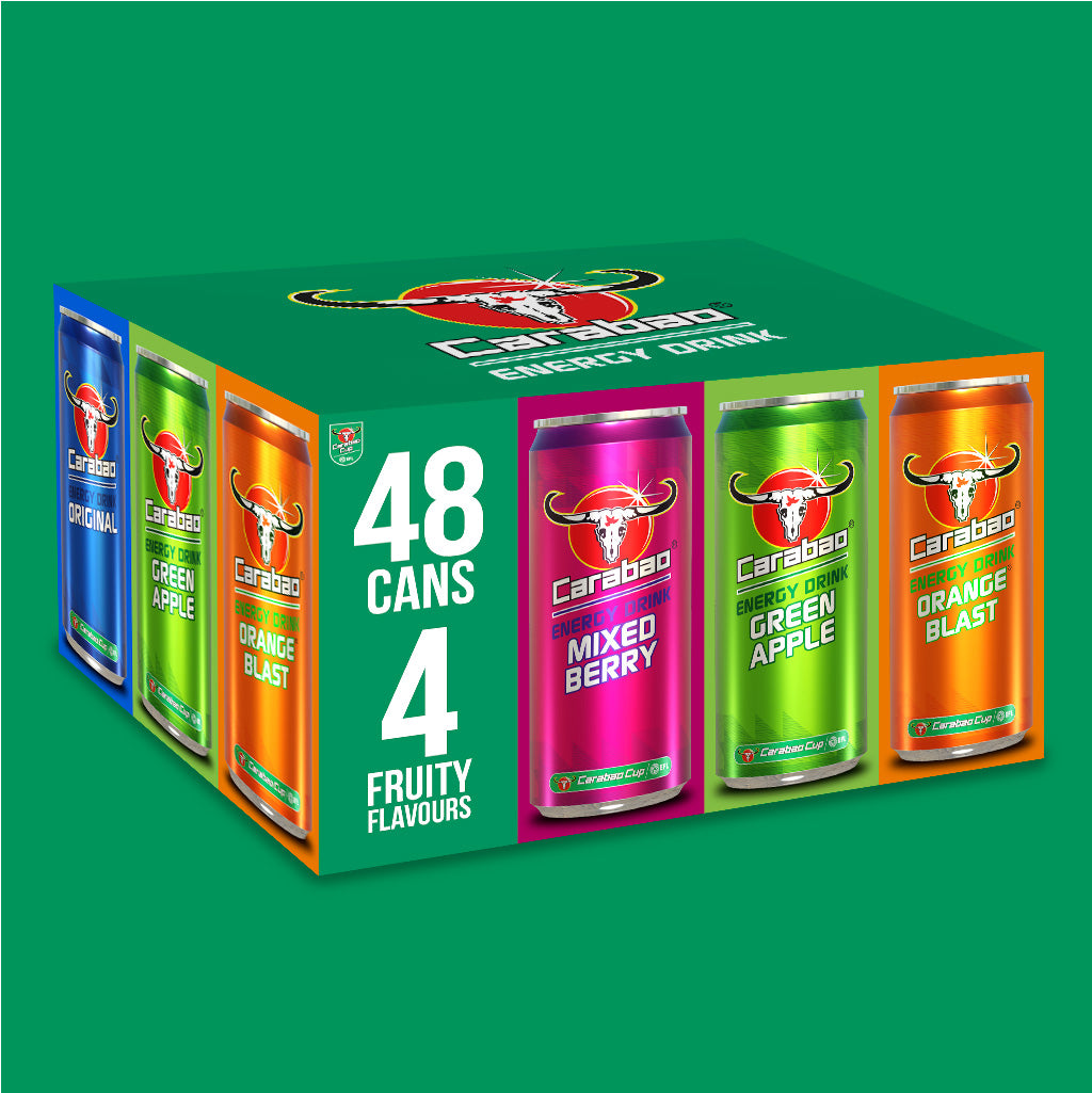 Get 4 tasty Carabao flavours in one pack - perfect for a party! 12 x cans of Carabao Energy Drink in each of the following flavours: Original, Mixed Berry, Orange Blast and Green Apple. Enjoy our deliciously light and sparkling energy drink bubbling with natural great tasting flavours. Half the sugar of traditional energy drinks and from only 41 calories per can. Contains taurine, caffeine and B vitamins which replenishes energy* and relieves fatigue*. Comes in 48 can pack of 330ml each.